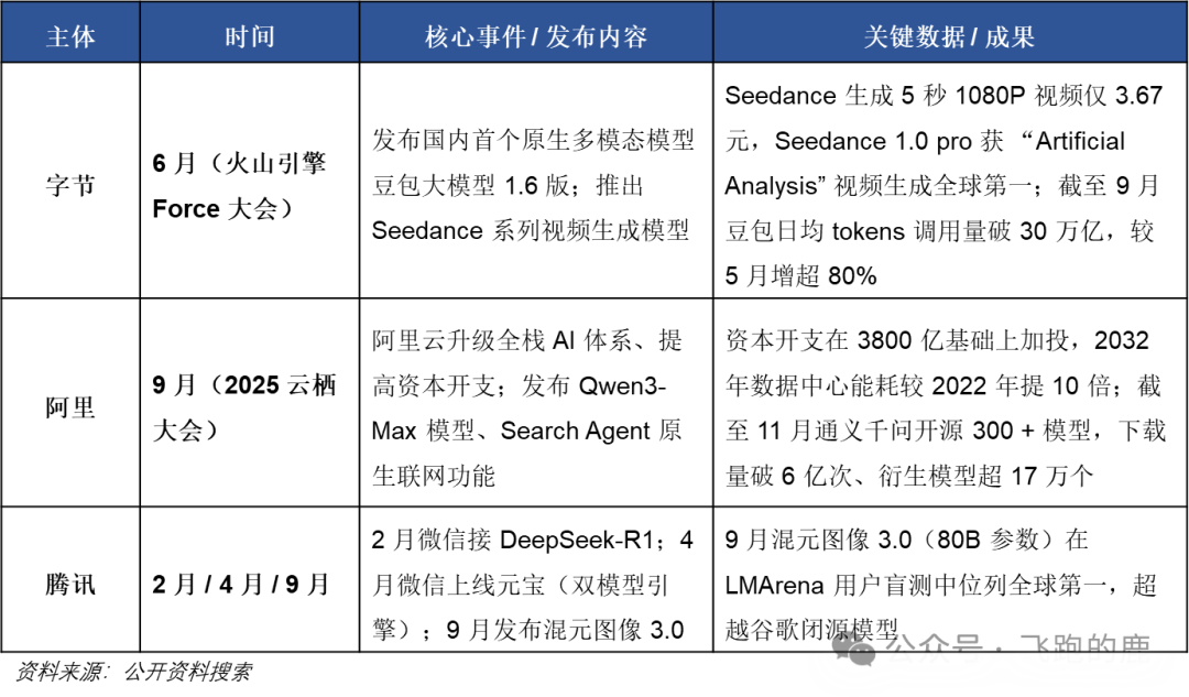 国内字节、阿里、腾讯纷纷推进AI布局:字节6月发布豆包大模型1.6版与Seedance系列模型,斩获国际赛事第一且调用量大涨;阿里9月升级全栈AI体系、推出相关模型,通义千问开源成果突出;腾讯2-9月通过微信落地模型、发布混元图像3.0,后者在LMArena盲测中登顶全球第一。
