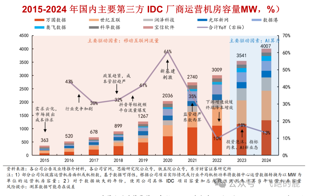 IDC行业的供给从之前的快速扩张慢慢变理性,现在正进入新周期。2015-2020年IDC跟着云计算、大数据发展越建越多,2020年后政策推动下更是扎堆建,质量有好有坏;2021年起因为需求没跟上,扩张慢了下来,现在还出现有的地方供过于求、不同区域情况不一样的问题,但智算中心的需求在快速增长,整个行业正朝着供需平衡的方向调整。