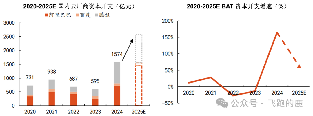2024年国内互联网厂商BAT(百度、阿里、腾讯)的资本开支如同AI基建的“燃料注入”,合计达1574亿元,同比激增165%。