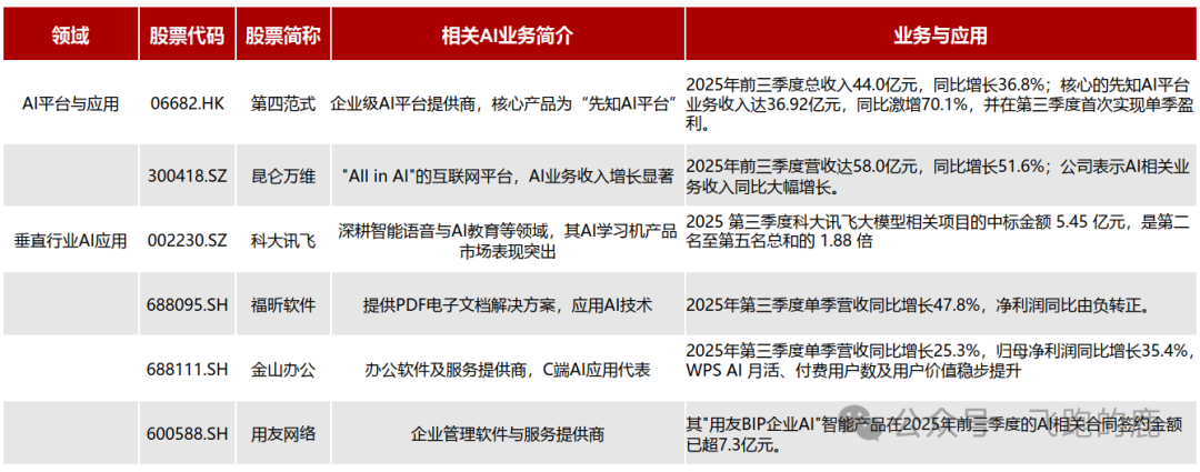 多家上市公司的财报显示,AI应用已成为其重要业绩驱动,进入价值兑现期:比如第四范式靠“先知AI平台”实现核心业务收入大增且单季盈利,昆仑万维AI业务助推营收高增,科大讯飞大模型项目中标金额远超同行,福昕软件、金山办公借AI实现营收/利润增长,用友网络的AI产品签约金额已超7.3亿元。