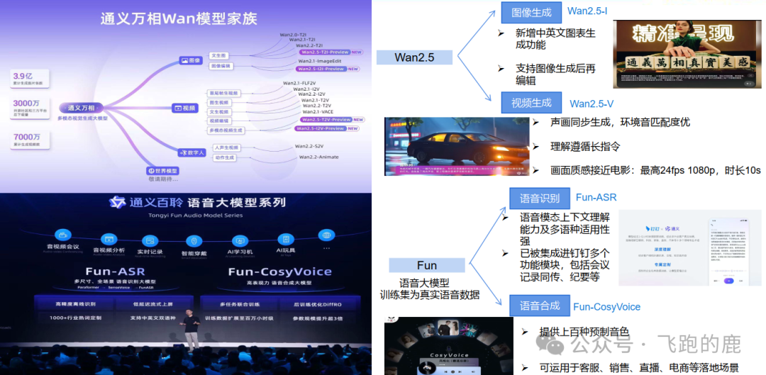 通义百聆Fun系列是语音大模型,Fun-ASR侧重语音识别,具备多语种适配能力且已集成到钉钉的会议记录等功能中,Fun-CosyVoice主打语音合成,提供上百种音色,可落地于客服、直播等场景,两类模型分别覆盖了多模态生成与语音交互的不同AI需求。