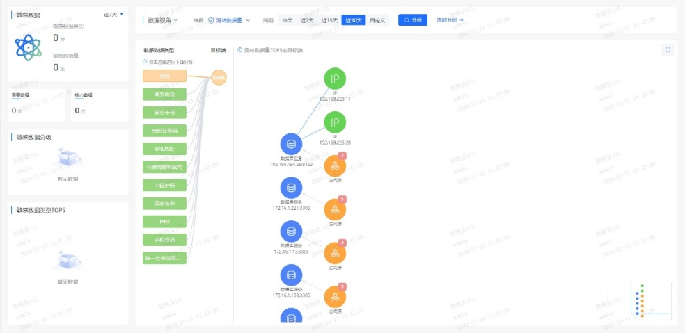 系统梳理客户身份信息(C1类)、账户信息(C2类)、交易行为(C3类)等关键数据资产,建立统一的数据目录;依据《金融数据安全 数据安全分级指南》(JR/T 0197—2020),自动对客户数据按敏感度打标,为核心数据设置更高防护等级;结合知识图谱技术,可视化呈现数据在业务系统、第三方接口、外包平台间的流转路径,精准识别高风险节点。
