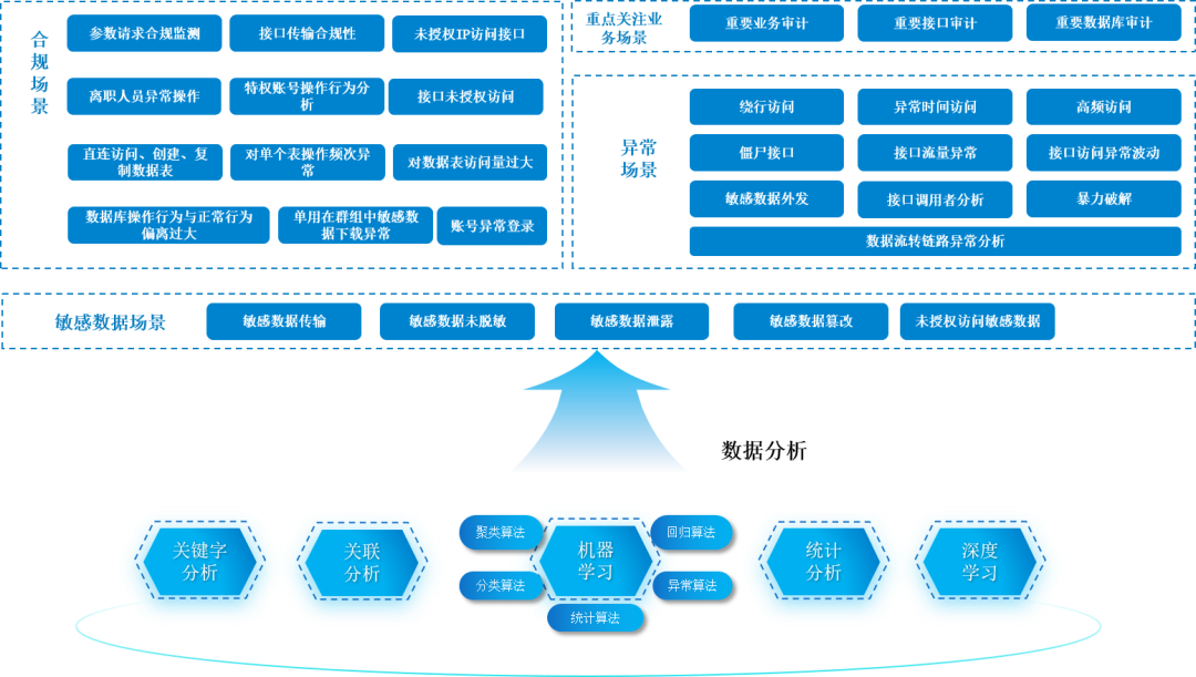 三是现有安全体系普遍缺乏针对敏感数据的智能识别、分级分类及行为分析能力,难以主动发现异常访问、越权操作、高频下载、非授权外发等高风险行为。同时,对网络流量中的数据内容缺乏深度解析,无法及时识别潜在的数据泄露通道(如通过API等方式),导致安全响应滞后。